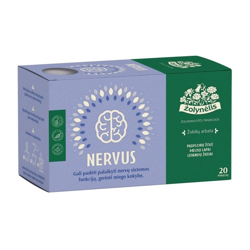 Žolelių arbata ŽOLYNĖLIS "Nervus": pasiflorų žolė, melisų lapai ir levandų žiedai. Gali padėti palaikyti normalią nervų sistemos funkciją, normalią miego kokybę. Pakuotėje 20 vnt.