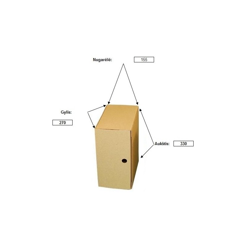 Archyvinė dėžė, pagaminta iš techninio kartono, 1.7 mm storio, suklijuota, nesulankstyta. Su skylute ant dėžės dangčio patogiam dėžės ištraukimui. Išmatavimai 330 x 270 x 155 mm.