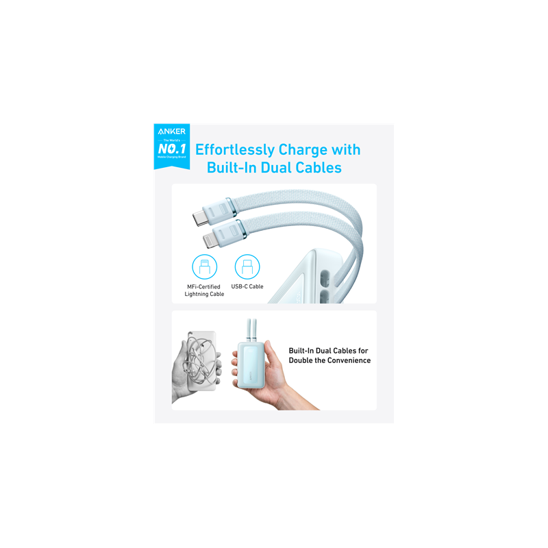 Anker Power Bank with Built-In USB-C and + Lighting Cable | A1680031 | 10000 mAh | 30W Output | Blue