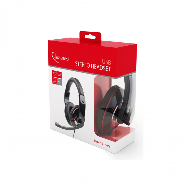 USB headphones with rotating microphone boom, Digital audio chipset for crystal clear sound, Practical in-line control for volume, mute and microphone, Large comfortable ear cushions, Comfortable, adjustable headband.