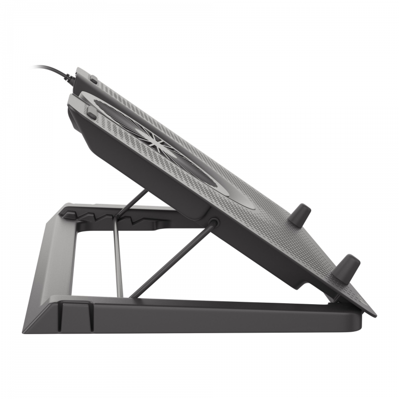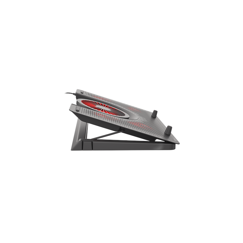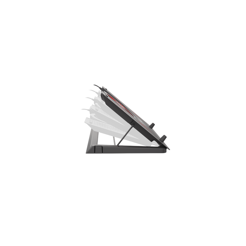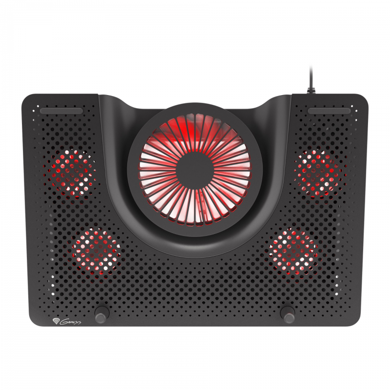Genesis Oxid 550 is a pad with a large cooling surface made of high-quality aluminum, which additionally enhances heat dissipation. Its construction ensures perfect cooling of both larger laptops up to 17.3” and smaller ones, improving significantly their operation. The cooling system in Genesis Oxid 550 is based on four smaller fans dissipating heat from under the laptop and one large fan providing efficient cooling airflow. With red backlight on each of the fans Genesis Oxid 550 gets a real gaming look. Genesis Oxid 550 provides proper viewing and typing angles with five height adjustment settings for user’s conformity and wrist protection, which can make huge difference during a long gaming fight. The pad is equipped with rubber anti-slip stands to avoid any undesired movement during usage.