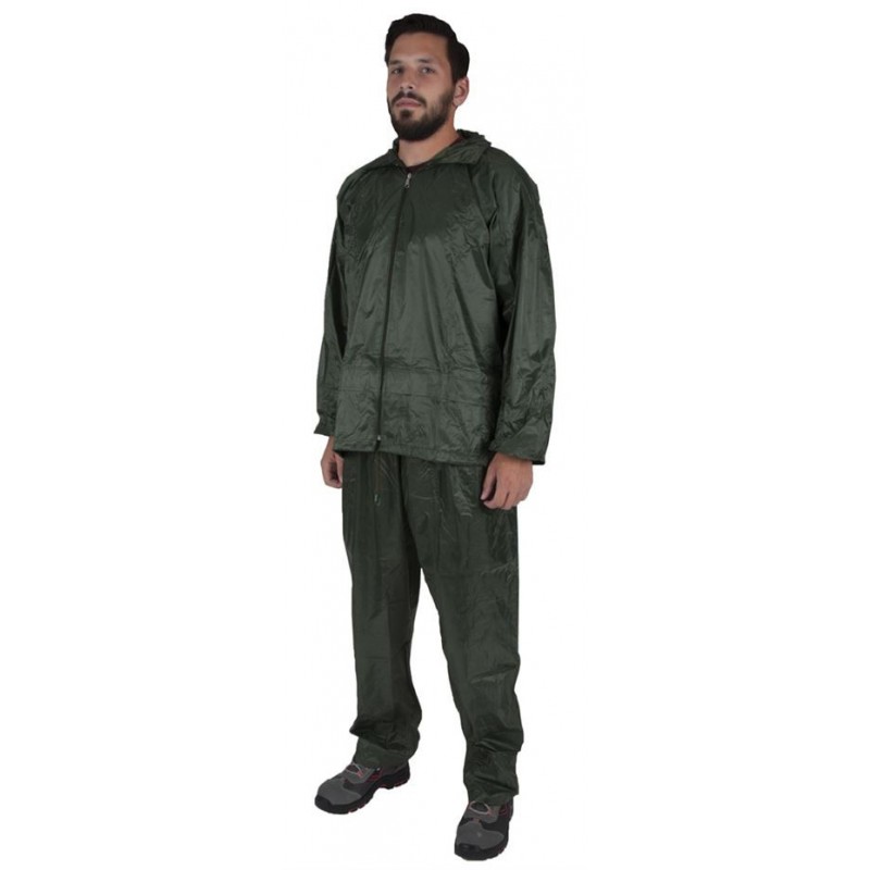 Dviejų dalių lietaus apranga su vandeniui atsparia medžiaga (storis 0,18 mm). Elastingas juosmuo, reguliuojamas kojų plotis. Striukės ilgis 85 cm, užsegama užtrauktuku, apykaklėje integruotas gobtuvas.