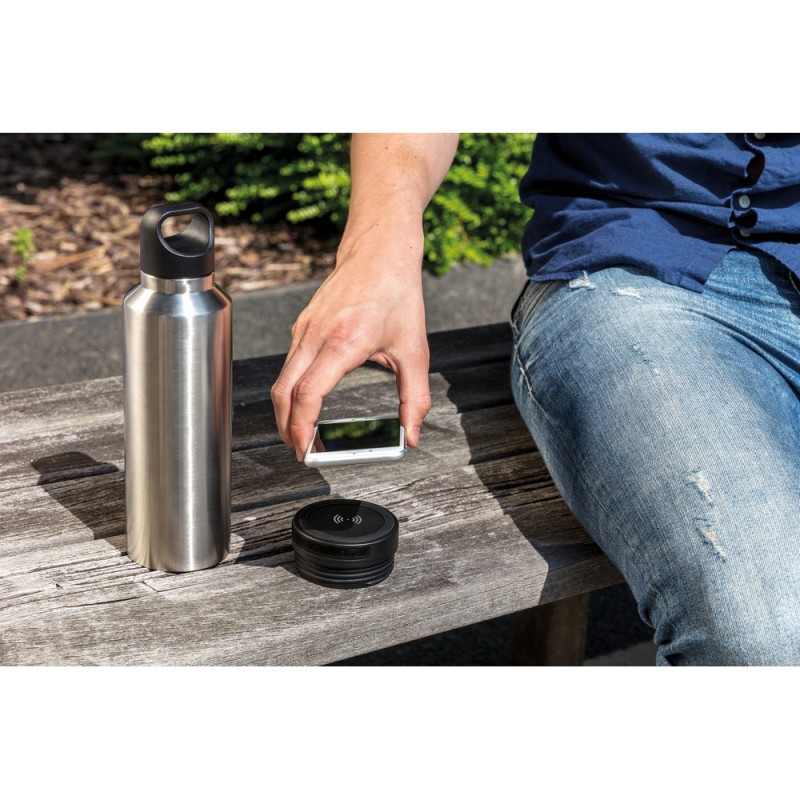 Vakuuminė gertuvė, 500 ml talpos ne tik ilgai išlaiko gėrimų temperatūrą, bet ir turi integruotą 5000 mAh belaidį įkroviklį. Apačioje esantis 5 W indukcinis įkroviklis leidžia patogiai įkrauti suderinamus išmaniuosius įrenginius – be laidų ir bet kur, kur esate.