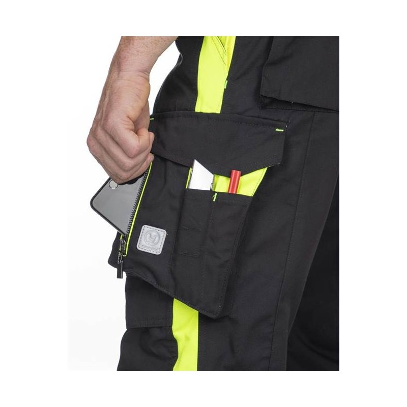 Darbo kelnės NEON yra šiuolaikiškas darbui skirtas glaudžiai kūną apgulantis ir gražiai atrodantis darbo rūbas. Darbo rūbai pagaminti iš tvarios poliesterio ir medvilnės drobinės medžiagos. Inovatyvus dizainas, suteikia puikų lankstumą ir judesių laisvumą. NEON serijos darbo apranga pasižymi ypatingu patogumu. Tam naudojamos anatominės formos, patvarios medžiagos ir nepamirštama šiuolaikinė sportiška išvaizda. Darbo kelnės su padidinto matomumo išskirtinės geltonos spalvos deriniu ir atšvaitinėmis juostelėmis. Geltona spalva atgaivina drabužių išvaizdą ir atlieka svarbių saugos funkcijų vaidmenį. Tai iš anksto perspėja apie jūsų judėjimą eisme ar statybų aikštelėje ir užkerta kelią nemaloniai rizikai. Darbinių kelnių privalumas yra patogumas, didelis kišenių kiekis, patvarumas ir geras matomumas. Įmautės rašikliams ir įrankiams. Specialūs antsiuvai įkišamiems antkeliams.