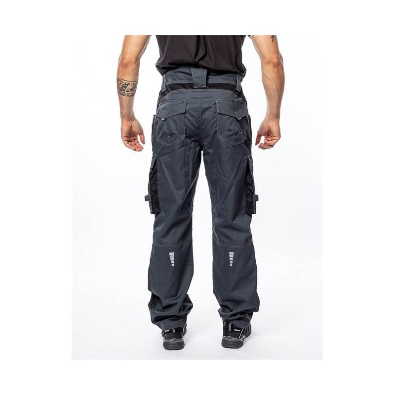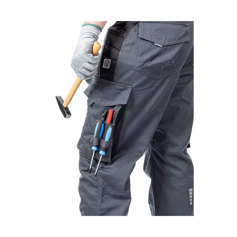 VISION kolekcijos darbo kelnės pagamintos iš aukštos kokybės medvilnės, poliesterio ir itin atsparių ruoželinių medžiagų mišinio. Iš pirmo žvilgsnio audinys primena džinsus dėl savo sportiško stiliaus ir kirpimo, kuris puikiai priglunda. Be to, kelnės siūlomos penkių spalvų, todėl jas lengva priderinti prie likusios darbo aprangos. VISION darbo kelnės turi dvigubas kelių dalis su kišene, kur prireikus galima įkišti antkelius. Dviguba medžiaga ir galimas kelių pagalvėlių įdėjimas maksimaliai padidina medžiagos apsaugą nuo trinties ir tuo pačiu sumažina kelių apkrovą klūpėjimo ar kitokio darbo krūvio metu kelių srityse. Daug įvairių įrankių kišenių. Gamintojas neapleido ir darbuotojo saugumo, todėl kelnės siuvamos kontrastingu rifliuotu siūlu ir komplektuojamos originaliais sidabriniais šviesą atspindinčiais raštais.