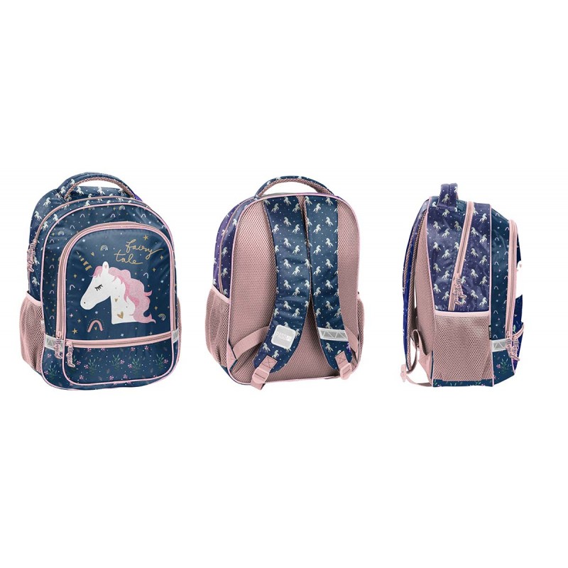 Kuprinė PASO Unicorn Fairy Tale. Puikiai tiks kaip pirma vaiko kuprinė einant į mokyklą. Dviejų skyrių. Dvi tinklinės kišenės šonuose ir viena maža kišenė priekyje, užsegama užtrauktuku. Ergonomiškos formos, standi nugara padengta tinkleliu. Profiliuoti pečių dirželiai, padengti tinkleliu. Matmenys: 41x34x15 cm. Kuprinės svoris: 470 g.