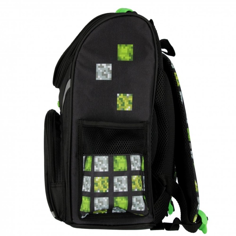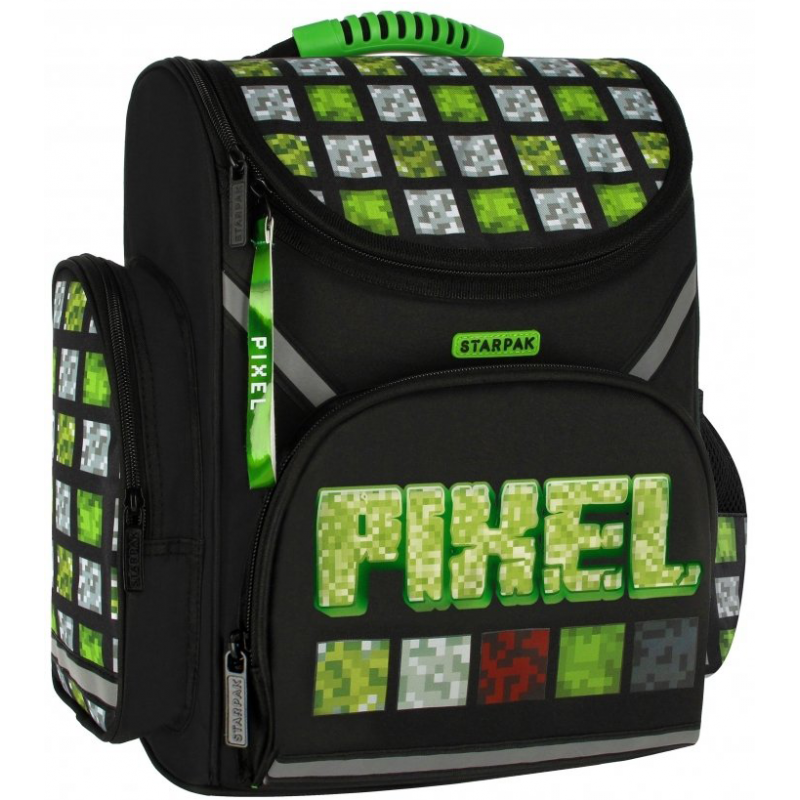 Kuprinė STARPAK Pixel Green. Puikiai tiks kaip pirma vaiko kuprinė einant į mokyklą. Vienas erdvus skyrius. Ergonomiškos formos, standi nugara. Patogios formos reguliuojami pečių dirželiai. Kuprinėje yra erdvi priekinė užtrauktuku užsegama kišenė ir dvi mažesnės kišenės šonuose. Standintas, guma padengtas dugnas apsaugo nuo nešvarumų ir drėgmės. Priekyje ir šonuose įsiūti šviesą atspindintys elementai, užtikrinantys vaiko saugumą. Dydis: 37x32x22 cm. Kuprinės svoris: 880 g.