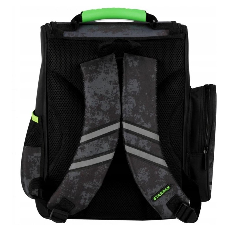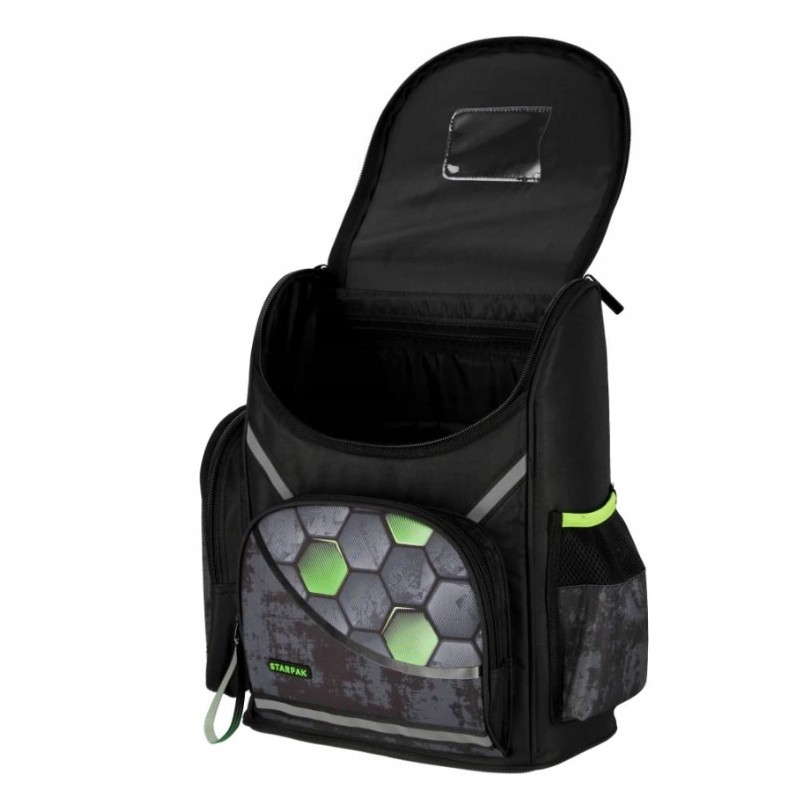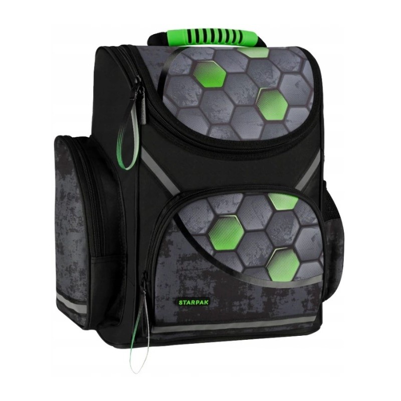 Kuprinė STARPAK Football. Puikiai tiks kaip pirma vaiko kuprinė einant į mokyklą. Vienas erdvus skyrius. Ergonomiškos formos, standi nugara. Patogios formos reguliuojami pečių dirželiai. Kuprinėje yra erdvi priekinė užtrauktuku užsegama kišenė ir dvi mažesnės kišenės šonuose. Standintas, guma padengtas dugnas apsaugo nuo nešvarumų ir drėgmės. Priekyje ir šonuose įsiūti šviesą atspindintys elementai, užtikrinantys vaiko saugumą. Dydis: 37x32x22 cm. Kuprinės svoris: 880 g.