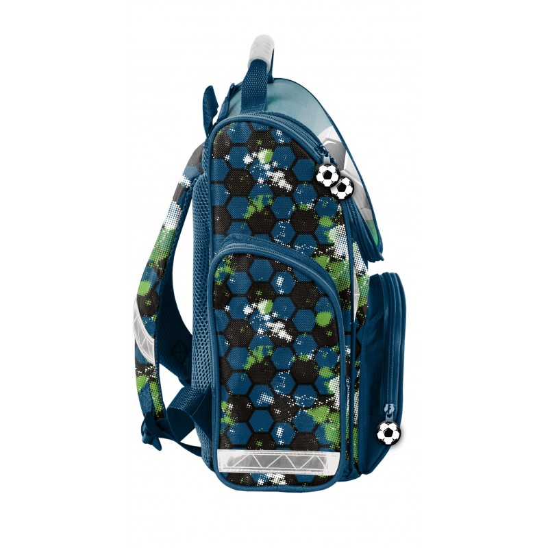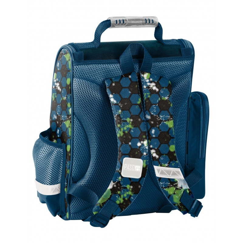 Kuprinė pradinukams PASO Football. Puikiai tiks kaip pirma vaiko kuprinė einant į mokyklą. Kuprinė turi vieną talpų pagrindinį skyrių užsegamą dvikrypčiu užtrauktuku. Dekoratyviniai užtrauktuko laikikliai ne tik suteikia išskirtinumo, bet ir palengvina atsegimą. Viduje yra pertvaros, padėsiančios tvarkingai organizuoti daiktus. Priekinėje dalyje yra praktiška kišenė su užtrauktuku. Šonuose – dvi papildomos kišenės: viena iš tinklinės medžiagos, tinkama gertuvei ar buteliukui, kita – užsegama užtrauktuku. Ergonomiškai formuota, standi nugaros dalis efektyviai sumažina krūvį vaiko stuburui. Minkštos, reguliuojamos ir ergonomiškai išformuotos petnešos padeda palaikyti taisyklingą laikyseną. Kuprinės apačia yra sutvirtinta, o atšvaitiniai elementai užtikrina didesnį saugumą kelyje. Matmenys: 36x28x15 cm. Kuprinės svoris: 900 g.