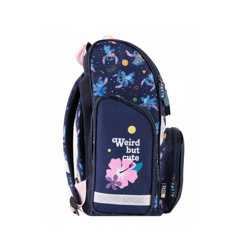 Kuprinė pradinukams PASO Disney Stitch Aloha. Puikiai tiks kaip pirma vaiko kuprinė einant į mokyklą. Kuprinė turi vieną talpų pagrindinį skyrių užsegamą dvikrypčiu užtrauktuku. Dekoratyviniai užtrauktuko laikikliai ne tik suteikia išskirtinumo, bet ir palengvina atsegimą. Viduje yra pertvaros, padėsiančios tvarkingai organizuoti daiktus. Priekinėje dalyje yra praktiška kišenė su užtrauktuku. Šonuose – dvi papildomos kišenės: viena iš tinklinės medžiagos, tinkama gertuvei ar buteliukui, kita – užsegama užtrauktuku. Ergonomiškai formuota, standi nugaros dalis efektyviai sumažina krūvį vaiko stuburui. Minkštos, reguliuojamos ir ergonomiškai išformuotos petnešos padeda palaikyti taisyklingą laikyseną. Kuprinės apačia yra sutvirtinta, o atšvaitiniai elementai užtikrina didesnį saugumą kelyje. Matmenys: 36x28x15 cm. Kuprinės svoris: 900 g.