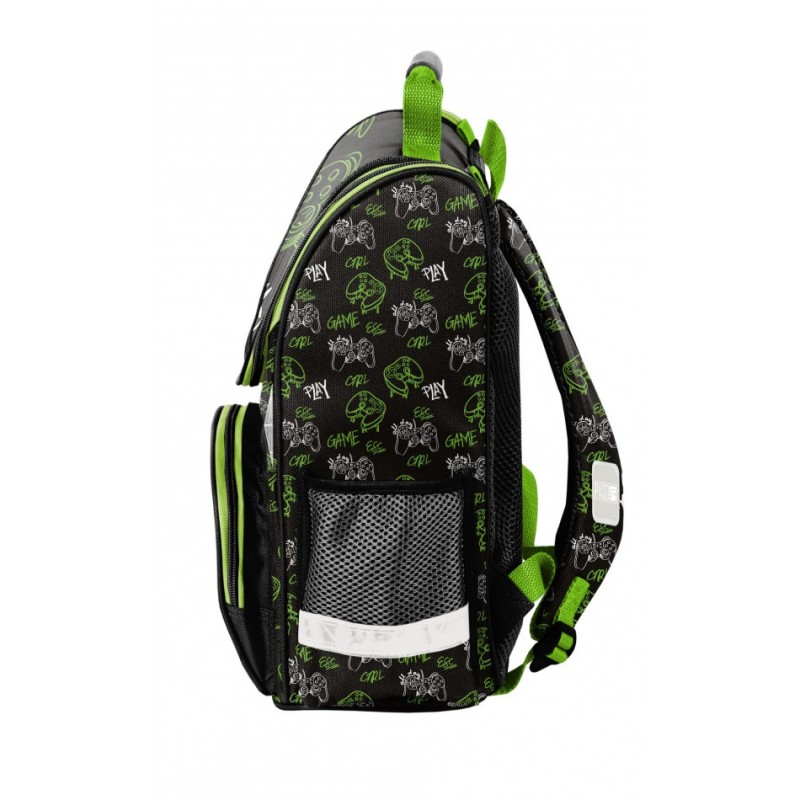 Kuprinė pradinukams PASO Game. Puikiai tiks kaip pirma vaiko kuprinė einant į mokyklą. Kuprinė turi vieną talpų pagrindinį skyrių užsegamą dvikrypčiu užtrauktuku. Dekoratyviniai užtrauktuko laikikliai ne tik suteikia išskirtinumo, bet ir palengvina atsegimą. Viduje yra pertvaros, padėsiančios tvarkingai organizuoti daiktus. Priekinėje dalyje yra praktiška kišenė su užtrauktuku. Šonuose – dvi papildomos kišenės: viena iš tinklinės medžiagos, tinkama gertuvei ar buteliukui, kita – užsegama užtrauktuku. Ergonomiškai formuota, standi nugaros dalis efektyviai sumažina krūvį vaiko stuburui. Minkštos, reguliuojamos ir ergonomiškai išformuotos petnešos padeda palaikyti taisyklingą laikyseną. Kuprinės apačia yra sutvirtinta, o atšvaitiniai elementai užtikrina didesnį saugumą kelyje. Matmenys: 36x28x15 cm. Kuprinės svoris: 900 g.