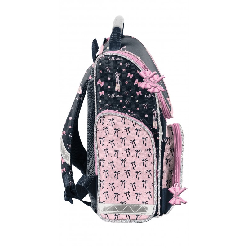 Kuprinė pradinukams PASO Ballerina. Puikiai tiks kaip pirma vaiko kuprinė einant į mokyklą. Kuprinė turi vieną talpų pagrindinį skyrių užsegamą dvikrypčiu užtrauktuku. Dekoratyviniai užtrauktuko laikikliai ne tik suteikia išskirtinumo, bet ir palengvina atsegimą. Viduje yra pertvaros, padėsiančios tvarkingai organizuoti daiktus. Priekinėje dalyje yra praktiška kišenė su užtrauktuku. Šonuose – dvi papildomos kišenės: viena iš tinklinės medžiagos, tinkama gertuvei ar buteliukui, kita – užsegama užtrauktuku. Ergonomiškai formuota, standi nugaros dalis efektyviai sumažina krūvį vaiko stuburui. Minkštos, reguliuojamos ir ergonomiškai išformuotos petnešos padeda palaikyti taisyklingą laikyseną. Kuprinės apačia yra sutvirtinta, o atšvaitiniai elementai užtikrina didesnį saugumą kelyje. Matmenys: 36x28x15 cm. Kuprinės svoris: 900 g.