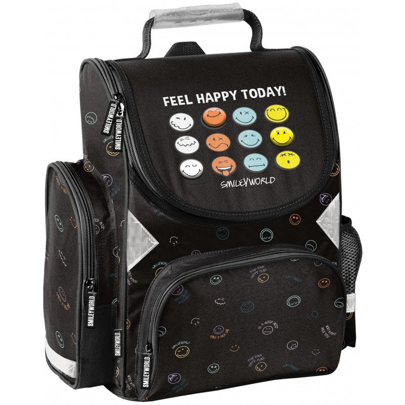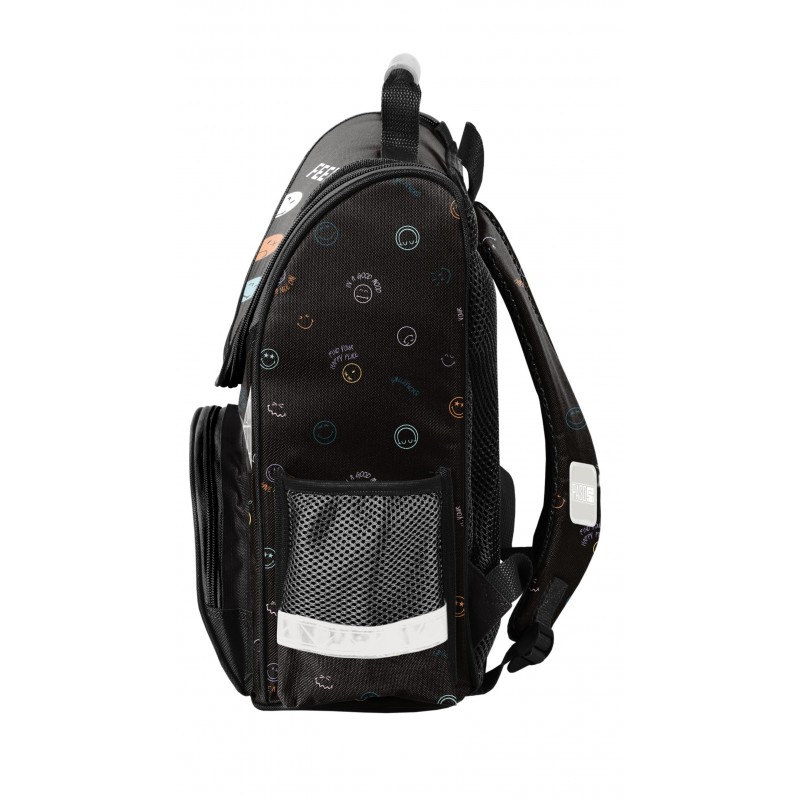 Kuprinė pradinukams PASO Smiley. Puikiai tiks kaip pirma vaiko kuprinė einant į mokyklą. Kuprinė turi vieną talpų pagrindinį skyrių užsegamą dvikrypčiu užtrauktuku. Dekoratyviniai užtrauktuko laikikliai ne tik suteikia išskirtinumo, bet ir palengvina atsegimą. Viduje yra pertvaros, padėsiančios tvarkingai organizuoti daiktus. Priekinėje dalyje yra praktiška kišenė su užtrauktuku. Šonuose – dvi papildomos kišenės: viena iš tinklinės medžiagos, tinkama gertuvei ar buteliukui, kita – užsegama užtrauktuku. Ergonomiškai formuota, standi nugaros dalis efektyviai sumažina krūvį vaiko stuburui. Minkštos, reguliuojamos ir ergonomiškai išformuotos petnešos padeda palaikyti taisyklingą laikyseną. Kuprinės apačia yra sutvirtinta, o atšvaitiniai elementai užtikrina didesnį saugumą kelyje. Matmenys: 36x28x15 cm. Kuprinės svoris: 900 g.