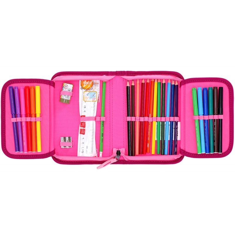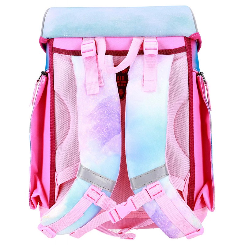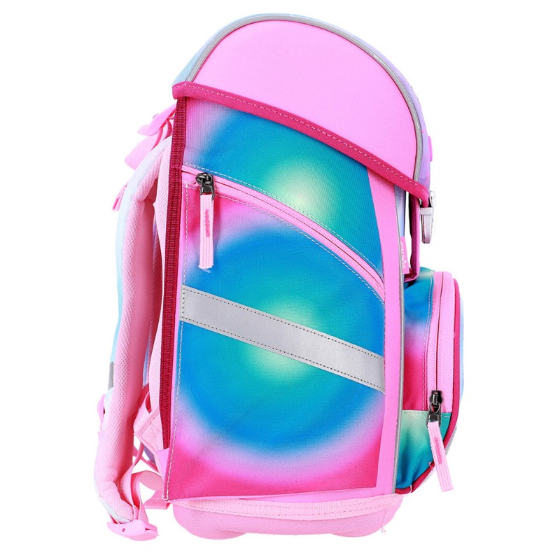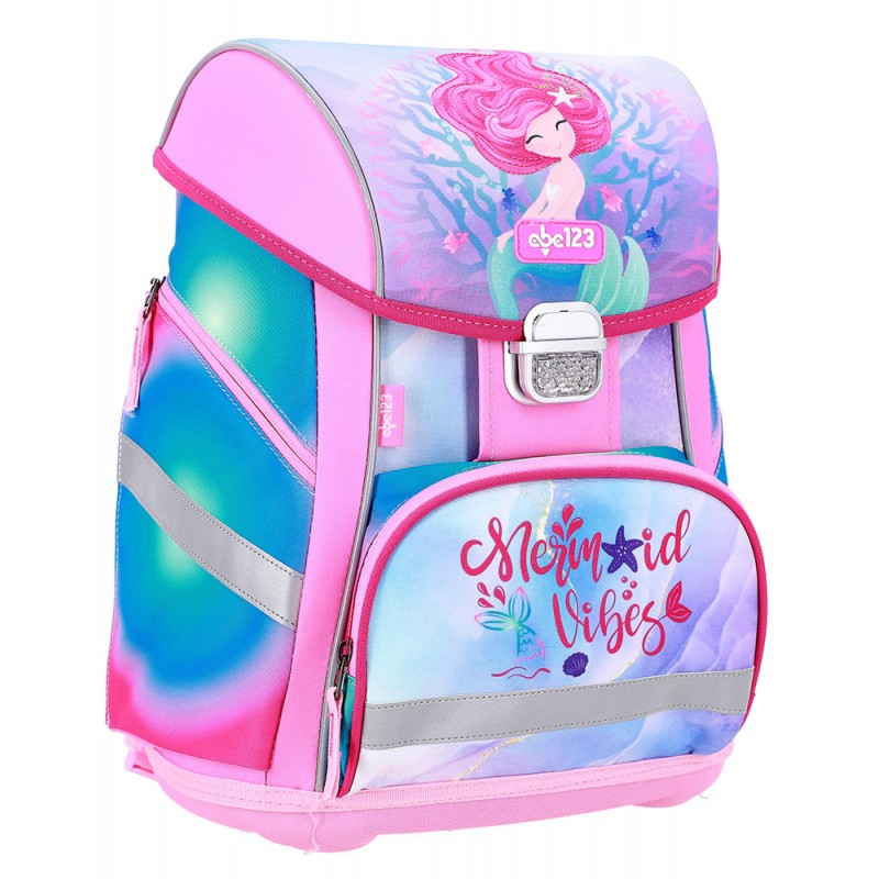 Kuprinė su priedais ABC123 Mermaid, 4 dalių. Šis 4 dalių mokyklinis rinkinys yra ergonomiškas, patogus ir saugus pasirinkimas kiekvienam moksleiviui. Kuprinė su specialiai suformuotais, paminkštintais pečių ir juosmens diržais užtikrina optimalų svorio pasiskirstymą ir komfortą nešiojant. Dėl šviesą atspindinčių elementų vaikas bus geriau matomas ir saugesnis tamsiu paros metu. Du pagrindiniai vidaus skyriai, lanksčios šoninės kišenės ir stabilus kietas dugnas leidžia tvarkingai susidėti daiktus. Kuprinė pagaminta iš aukščiausios kokybės, vandeniui atsparių medžiagų. Komplekte taip pat yra: sportinis krepšys, forminis užpildytas penalas su 28 vnt. priemonių, tuščias vieno skyriaus penalas. Matmenys: 40x27x18 cm. Kuprinės svoris apie 1000 g. Valyti drėgna šluoste.