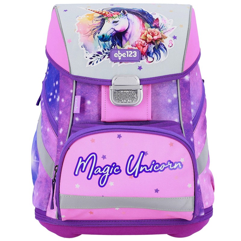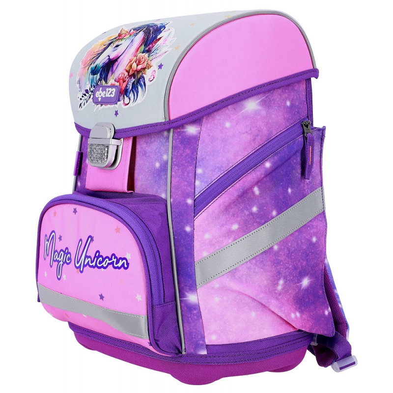 Kuprinė su priedais ABC123 Unicorn, 4 dalių. Šis 4 dalių mokyklinis rinkinys yra ergonomiškas, patogus ir saugus pasirinkimas kiekvienam moksleiviui. Kuprinė su specialiai suformuotais, paminkštintais pečių ir juosmens diržais užtikrina optimalų svorio pasiskirstymą ir komfortą nešiojant. Dėl šviesą atspindinčių elementų vaikas bus geriau matomas ir saugesnis tamsiu paros metu. Du pagrindiniai vidaus skyriai, lanksčios šoninės kišenės ir stabilus kietas dugnas leidžia tvarkingai susidėti daiktus. Kuprinė pagaminta iš aukščiausios kokybės, vandeniui atsparių medžiagų. Komplekte taip pat yra: sportinis krepšys, forminis užpildytas penalas su 28 vnt. priemonių, tuščias vieno skyriaus penalas. Matmenys: 40x27x18 cm. Kuprinės svoris apie 1000 g. Valyti drėgna šluoste.