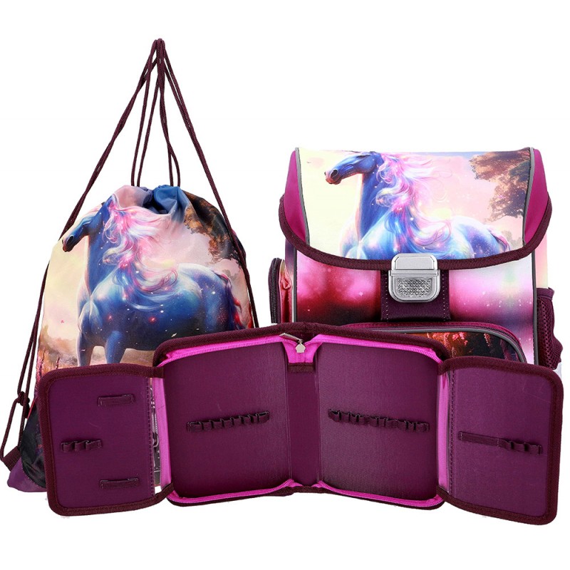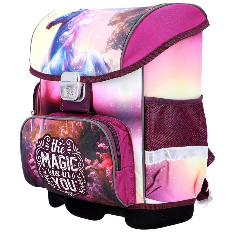 Kuprinė su priedais ABC123 Unicorn, 3 dalių. Šis 3 dalių mokyklinis rinkinys yra puikus pasirinkimas pradinukui, kuriame rasite ergonomišką kuprinę, penalą ir maišelį sportinei aprangai ar batams. Kuprinė turi patogią, ortopedinę laikyseną palaikančią nugarinę dalį, reguliuojamas petnešas ir krūtinės diržą, todėl nešiojama itin patogiai. Su tvirtais užtrauktukais, 2 pagrindiniais skyriais, šoninėmis kišenėmis bei atšvaitais, užtikrinanti funkcionalumą ir saugumą. Kietas dugnas. Pridedamas vieno skyrelio penalas su dviem atvartais ir pamokų tvarkaraščiu, o lengvas maišelis su virvelėmis puikiai tiks sportinei aprangai. Tai praktiškas pasirinkimas kiekvienai mokslo metų dienai. Talpa 16 L. Matmenys 35x 30x18 cm. Valyti drėgna šluoste.