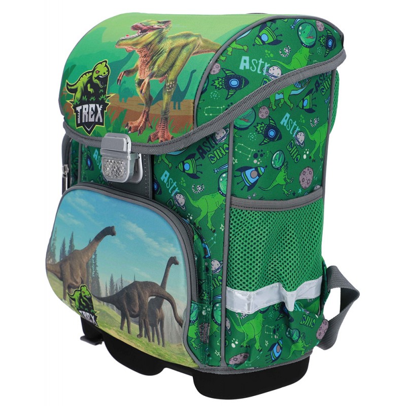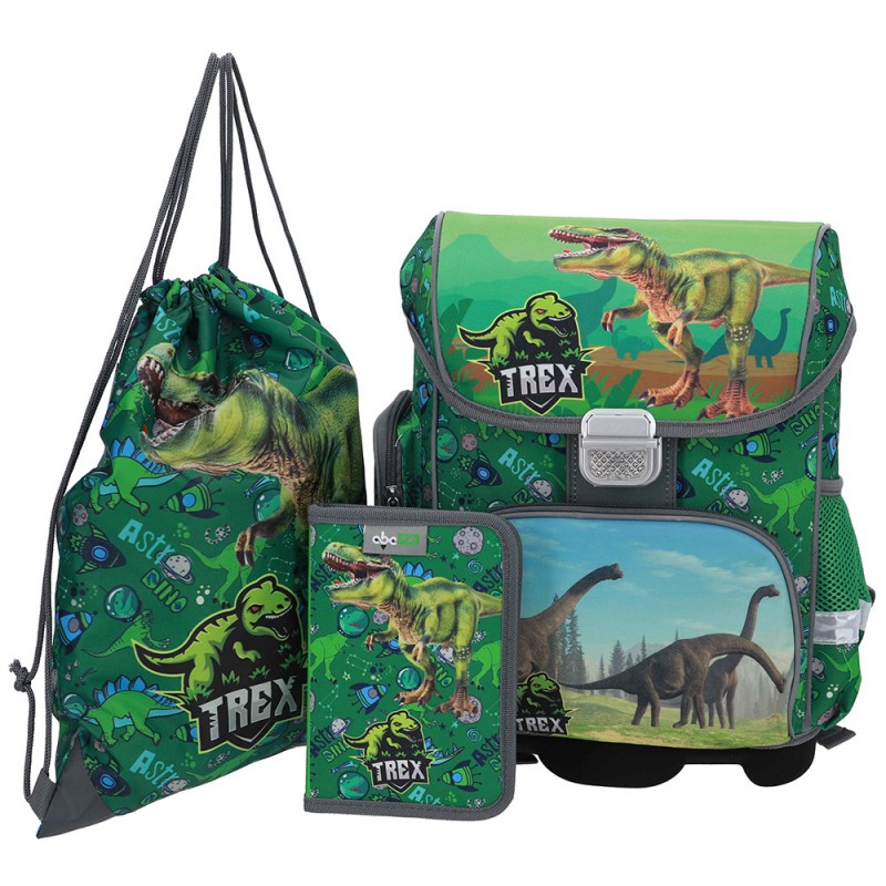 Kuprinė su priedais ABC123 Dino, 3 dalių. Šis 3 dalių mokyklinis rinkinys yra puikus pasirinkimas pradinukui, kuriame rasite ergonomišką kuprinę, penalą ir maišelį sportinei aprangai ar batams. Kuprinė turi patogią, ortopedinę laikyseną palaikančią nugarinę dalį, reguliuojamas petnešas ir krūtinės diržą, todėl nešiojama itin patogiai. Su tvirtais užtrauktukais, 2 pagrindiniais skyriais, šoninėmis kišenėmis bei atšvaitais, užtikrinanti funkcionalumą ir saugumą. Kietas dugnas. Pridedamas vieno skyrelio penalas su dviem atvartais ir pamokų tvarkaraščiu, o lengvas maišelis su virvelėmis puikiai tiks sportinei aprangai. Tai praktiškas pasirinkimas kiekvienai mokslo metų dienai. Talpa 16 L. Matmenys 35x 30x18 cm. Valyti drėgna šluoste.
