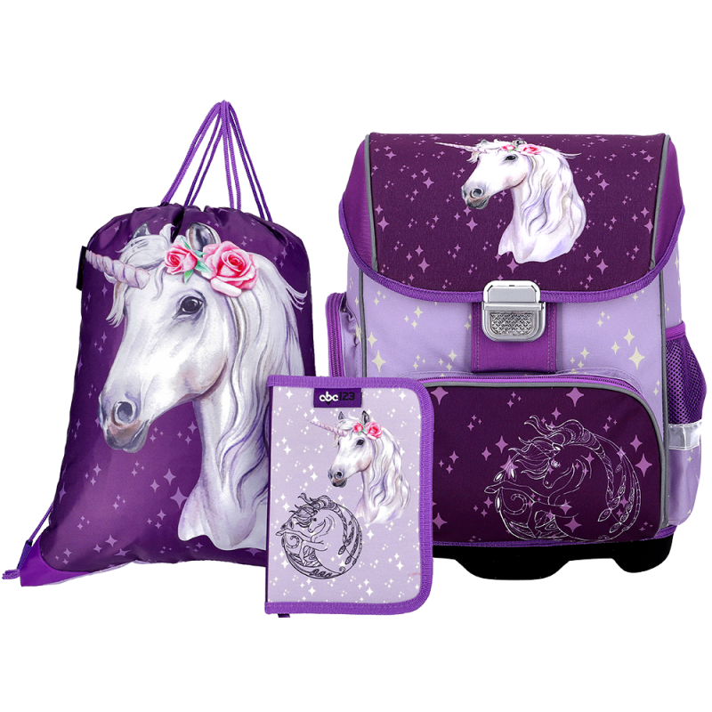 Kuprinė su priedais ABC123 Unicorn, 3 dalių. Šis 3 dalių mokyklinis rinkinys yra puikus pasirinkimas pradinukui, kuriame rasite ergonomišką kuprinę, penalą ir maišelį sportinei aprangai ar batams. Kuprinė turi patogią, ortopedinę laikyseną palaikančią nugarinę dalį, reguliuojamas petnešas ir krūtinės diržą, todėl nešiojama itin patogiai. Su tvirtais užtrauktukais, 2 pagrindiniais skyriais, šoninėmis kišenėmis bei atšvaitais, užtikrinanti funkcionalumą ir saugumą. Kietas dugnas. Pridedamas vieno skyrelio penalas su dviem atvartais ir pamokų tvarkaraščiu, o lengvas maišelis su virvelėmis puikiai tiks sportinei aprangai. Tai praktiškas pasirinkimas kiekvienai mokslo metų dienai. Talpa 16 L. Matmenys 35x 30x18 cm. Valyti drėgna šluoste.