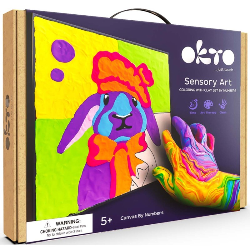 Pasinerkite į naujus lytėjimo pojūčius, sukurkite savo šedevrą, nupieštą pirštų galiukais. Rinkinyje yra viskas, ko reikia nuostabiam triušio paveikslui sukurti. Ekologiškas lengvas molis, kuris suteikia galimybę sukurti įvairias formas. Molis sustingsta ir išlaiko savo formą, išdžiūvęs jis įgauna elastingą ir matinį efektą. Nelimpa prie rankų, nepalieka spalvos pėdsakų, lengvai susirenka nuo kietų paviršių. Saugus sveikatai, netoksiškas, nesukelia alergijos. Tik natūralūs ingredientai. Atvirame ore molis iš dalies praranda savo savybes per 10 minučių, todėl nepalikite jo džiūti. Jeigu molis šiek tiek sukietėja ar praranda lipnumą, įlašinkite kelis lašus vandens ir paminkykite. Kad geriau liptų prie lentelės, galite ją švelniai patrinti sausa servetėle ar kempinėle. Rekomenduojama džiovinti paveikslą maždaug 48 valandas, po džiovinimo galima padengti apsauginiu laku. Užbaigtas paveikslas atsparus deformacijai, lengvas ir šilkinis. ĮSPĖJIMAS: užteršimo atveju nuplaukite daiktus karštu vandeniu, jei reikia, pakartokite. Nešildykite. Laikyti atokiai nuo degių šaltinių. Nedžiovinkite dujinėse ir elektrinėse orkaitėse. Neišmeskite pakuotės, joje yra svarbi informacija. Šis rinkinys lavina smulkiąją motoriką, judesių koordinavimą, kūrybiškumą ir vaizduotę, atmintį ir dėmesingumą. Rekomenduojama vaikams nuo 5 metų. Įspėjimas! Netinka jaunesniems kaip trejų metų vaikams. Smulkios detalės, pavojus užspringti. Naudoti prižiūrint suaugusiesiems. Rinkinį sudaro natūrali drobė, instrukcija, medinis modeliavimo įrankis, molio rinkinys.