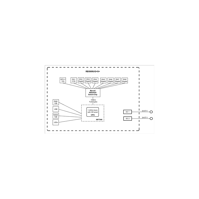 MikroTik Wired Ethernet Router RB5009UG+S+IN, Quad core 1.4 GHz CPU, 1xSFP+, 7xGigabit LAN, 1x2.5G LAN, 1xUSB, Can be powered in 3 different ways, CPU temperature monitor, Mounts FOUR of these Routers in a Single 1U Rackmount Space, RouterOS L5 MikroTik Wired Ethernet Router RB5009UG+S+IN No Wi-Fi 10/100/1000 Mbit/s Ethernet LAN (RJ-45) ports 7 Mesh Support No MU-MiMO No No mobile broadband 1