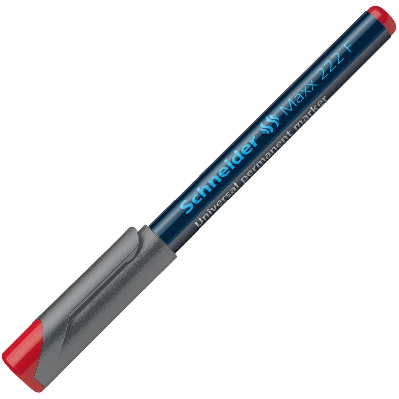 Permanentinis žymeklis SCHNEIDER Maxx 222 F. Plastikinis korpusas. Atsparus vandeniui. Neuždžiūna paliktas atidarytas keletą dienų. Galima rašyti ant įvairių paviršių. Apvalia galvute. Brėžio storis 0.7 mm. Raudonos spalvos.