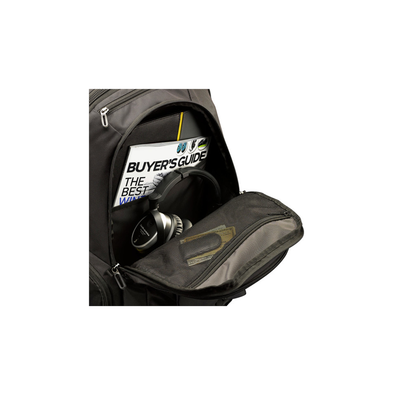 1. Full electronics capacity with a dedicated compartment that fits both a 17.3 inch laptop and an iPad® or tablet (encased or not)2. Durable, water-resistant nylon materials protect this backpack from daily wear and tear3. Designed with a tapered, streamlined body plus top and bottom grab handles to load easily into overhead bins and small spaces4. Top-loading pocket with plush lining helps prevent a smartphone from getting crushed or scratched5. Middle compartment contains a spacious area for folders, books or headphones and a slim pocket sized for files, documents or magazines