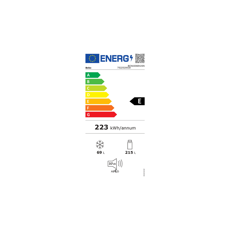 BEKO Refrigerator | BCNA306E42SN | Energy efficiency class E | Built-in | Combi | Height 193.5 cm | No Frost system | Fridge net capacity 215 L | Freezer net capacity 69 L | Display | 37 dB | White