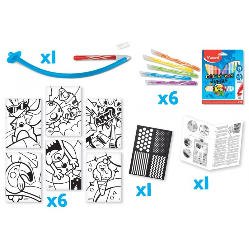 Su pučiamų flomasterių ir trafaretų rinkiniu MAPED Pop´Art sukurk gražiausius piešinius! Išmėgink naują spalvinimo būdą pučiant dažus. Piešti šiuo būdu yra itin paprasta ir smagu. Pučiant išgaunamas ypatingas dažų paskirstymo efektas. Lanksti žarnelė užtikrina judesių laisvę. Rekomenduojama vaikams nuo 5 metų. Įspėjimas! Netinka jaunesniems kaip trejų metų vaikams. Smulkios detalės, pavojus užspringti. Naudoti prižiūrint suaugusiesiems. Rinkinį sudaro pūtimo priedas, šeši MAPED Color’Peps Jungle flomasteriai, 6 kortelės, šablonų lapas.