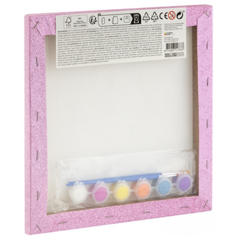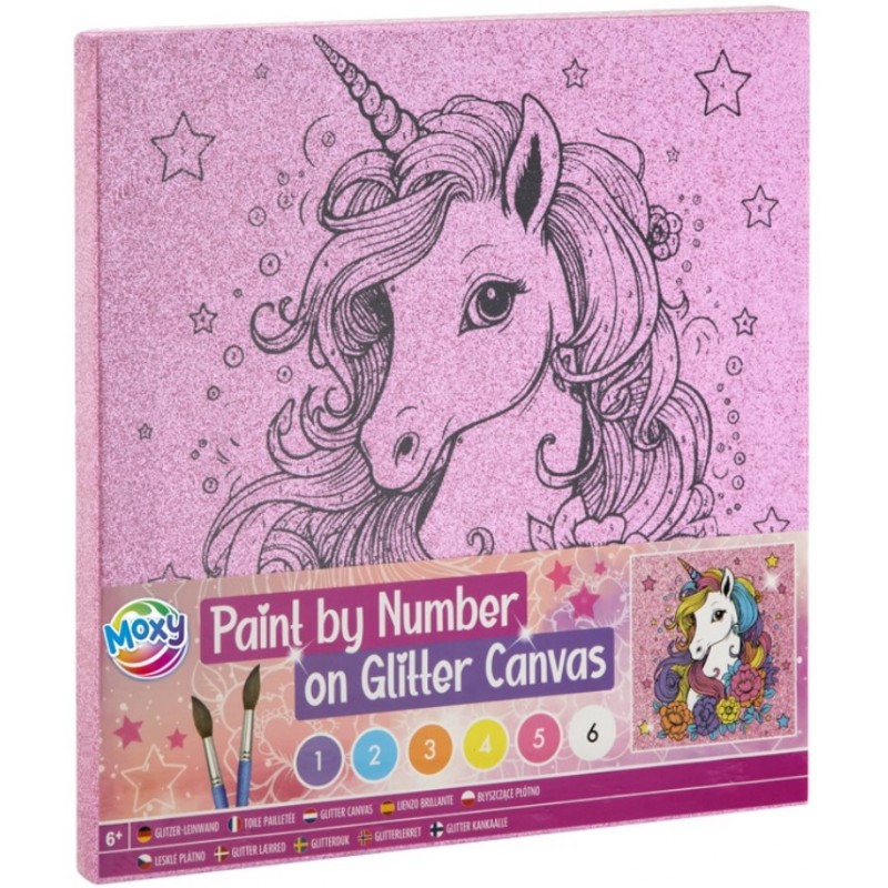 Spalvinimo pagal skaičius rinkinys GRAFIX Vienaragis, blizganti drobė. Rinkinyje yra blizganti drobė su paruoštu piešiniu, 2 sintetiniai teptukai ir 6 dažų spalvos. Rekomenduojama vaikams nuo 6 metų. Įspėjimas! Netinka jaunesniems kaip trejų metų vaikams. Naudoti prižiūrint suaugusiesiems. Išmatavimai: 25x25 cm.