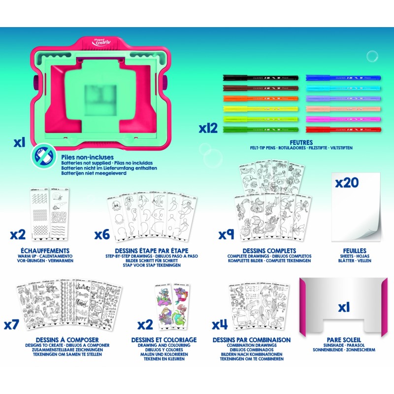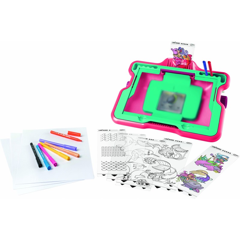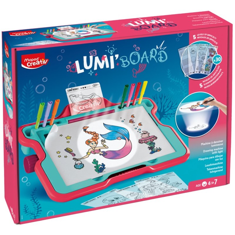 Ši piešimo lenta yra ypatinga, jos ekranas šviečia! MAPED Creativ Lumi Board "Mermaid" padarys piešimą daug įdomesnį! Naudodami šią Lumi Board piešimo lentos versiją su undinėlėmis, vaikai gali piešti undinėles ir povandeninį pasaulį. Tai originali kūrybinė veikla, skirta kurti asmenines spalvinimo knygeles. Naudojimas: vaikas pirmiausia pasirenka norimą šablono lapą. Žvaigždutės nurodo kiekvieno lapo sudėtingumo lygį, tad puikiai tinka mokytis piešti ir tobulėti įvairaus amžiaus ir poreikių vaikams. Tada tereikia įstumti laminuotą lapą į piešimo lentą ir pasukti ratuką. Šviesos projekcija padeda perpiešti šabloną. Vaikas gali derinti skirtingus šablonus ir sukurti savo spalvinimo lapą. Tereikia jį nuspalvinti su pridedamais flomasteriais! Reikalingos 4 LR6/AA tipo baterijos, jos nepridedamos. Baterijas sudėkite, kaip pavaizduota paveiksliuke ant pakuotės. Keisdami baterijas, naudokite kryžminį atsuktuvą. Nemaišykite senų ir naujų baterijų, jas naudokite pagal paskirtį. Baterijas keiskite tik su suaugusiojo priežiūra. Panaudotų baterijų nemeskite į buitinių atliekų konteinerius, o utilizuokite pagal galvaninių elementų tvarkymo taisykles. Rekomenduojama vaikams nuo 4 metų. Įspėjimas! Netinka jaunesniems kaip trejų metų vaikams. Smulkios detalės, pavojus užspringti. Naudoti prižiūrint suaugusiesiems. Rinkinį sudaro: švieslentė, 30 plastikinių šablonų piešiniams perkelti, 12 MAPED flomasterių, 20 A4 lapų, saulės skydelis.