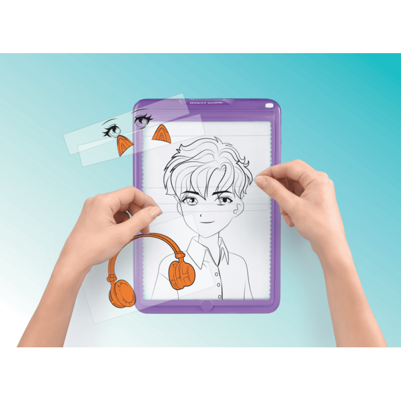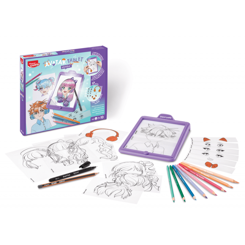 Ši piešimo lenta yra ypatinga, jos ekranas šviečia! MAPED Creativ "Avatar Studio Manga" padarys piešimą daug įdomesnį! Ji yra skirta išmokti piešti manga personažus, visiems manga mylintiems vaikams! Su šia lenta vaikai gali sukurti daugybę unikalių asmeninių manga portretų. Vaikai lengvai gali piešti visos šeimos, draugų ar išgalvotų personažų portretus, naudodamiesi 17 šablonų, kuriuose yra veidai, akys, šukuosenos, aksesuarai ir kt. Naudojimas: vaikas pirmiausia pasirenka norimą šablono lapą. Tada tereikia įstumti lapą į piešimo lentą ir įjungti šviesą. Šviesos projekcija padeda perpiešti šabloną. Vaikas gali derinti skirtingus šablonus ir sukurti savo spalvinimo lapą. Tereikia jį nuspalvinti su pridedamais pieštukais! Ši piešimo lenta yra nešiojama, todėl vaikai gali ją pasiimti visur. Puikiai tinka užsiimti veikla namuose ar automobilyje. Reikalingos 3 LR03/AAA tipo baterijos, jos nepridedamos. Baterijas sudėkite, kaip pavaizduota paveiksliuke ant pakuotės. Keisdami baterijas, naudokite kryžminį atsuktuvą. Nemaišykite senų ir naujų baterijų, jas naudokite pagal paskirtį. Baterijas keiskite tik su suaugusiojo priežiūra. Panaudotų baterijų nemeskite į buitinių atliekų konteinerius, o utilizuokite pagal galvaninių elementų tvarkymo taisykles. Rekomenduojama vaikams nuo 7 metų. Įspėjimas! Netinka jaunesniems kaip trejų metų vaikams. Smulkios detalės, pavojus užspringti. Naudoti prižiūrint suaugusiesiems. Rinkinį sudaro: švieslentė, 17 šablonų piešiniams perkelti, 8 MAPED spalvoti pieštukai, 1 pieštukas, 1 juodas flomasteris, 5 balti A formato lapai.