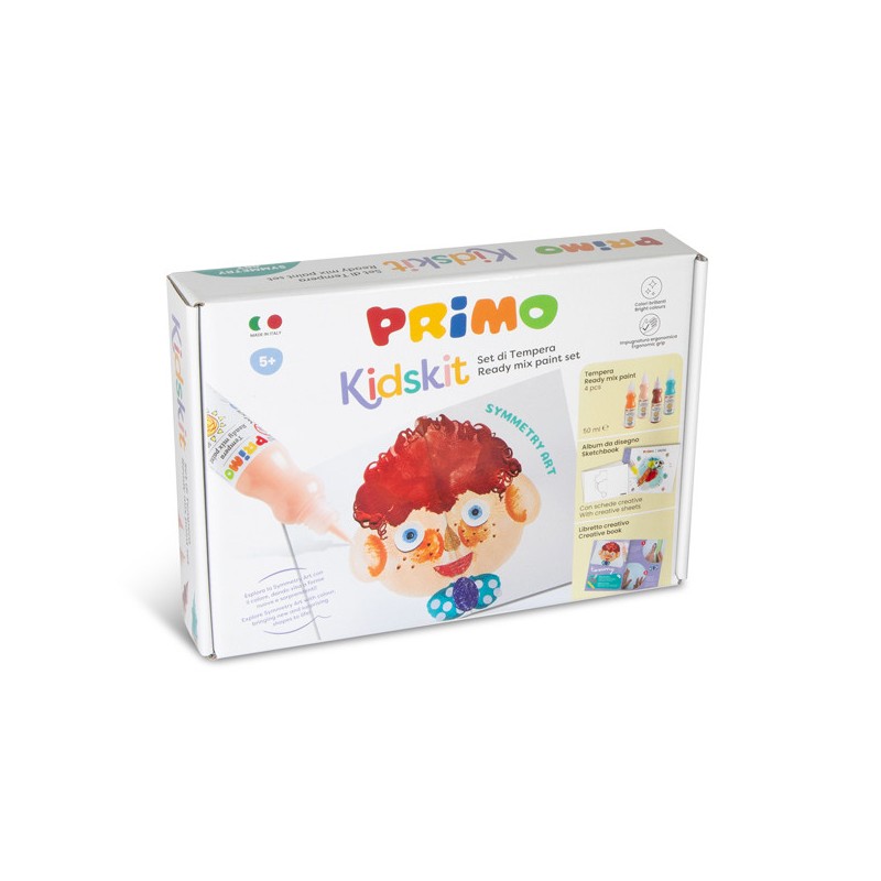 Kūrybinis piešimo rinkinys PRIMO Simetrijos menas. Šis rinkinys padeda vaikams pažinti simetrijos principą mene, eksperimentuojant su spalvų deriniais ir stebint atspindžio efektą. Komplekte yra 4 x 50 ml paruošti dažų buteliukai (oranžinė, rožinė, ruda, turkio) su srauto kontrolės antgaliu, A5 formato eskizų bloknotas iš aukštos kokybės 220 g popieriaus (10 lapų, iš kurių 3 su gairėmis pirmiesiems darbams) ir kūrybinis vadovas, žingsnis po žingsnio supažindinantis su technika bei skatinantis eksperimentuoti ir lavinti kūrybiškumą. Rekomenduojama vaikams nuo 7 metų.