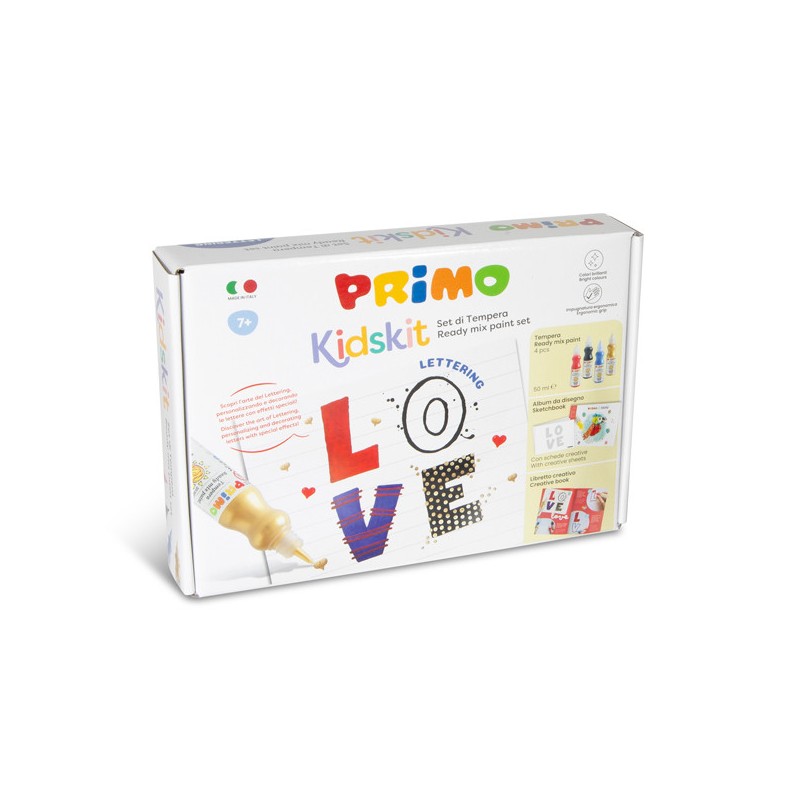 Kūrybinis piešimo rinkinys PRIMO Raidžių menas. Šis rinkinys kviečia vaikus atrasti abėcėlę ir rašymo meną per tapybą: paverčiant raides ir žodžius tikrais meno kūriniais. Komplekte rasite 4 x 50 ml paruoštų dažų buteliukus (raudona, juoda, mėlyna, auksinė) su patogiu srauto kontrolės antgaliu, A5 formato eskizų bloknotą iš aukštos kokybės 220 g popieriaus (10 lapų, iš kurių 3 su gairėmis pirmiesiems darbams) bei kūrybinį vadovą, kuris žingsnis po žingsnio moko lettering technikos, skatina eksperimentuoti ir lavinti kūrybiškumą. Rekomenduojama vaikams nuo 7 metų.