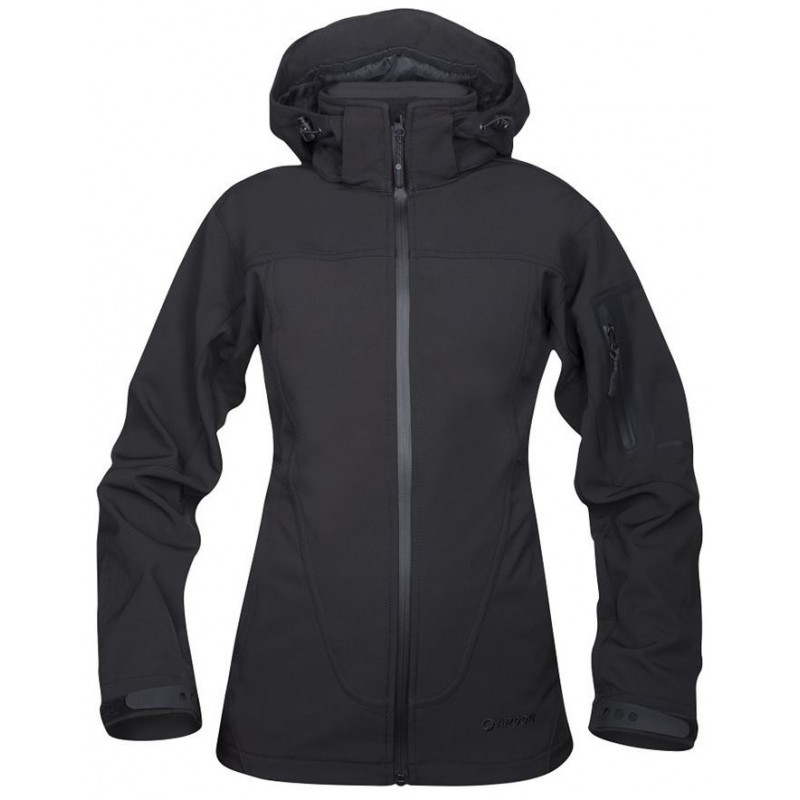 Moteriška Softshell striukė su gobtuvu. Šiek tiek patrumpintas kirpimas, priglundantis prie figūros. Neperšlampama medžiaga, atsparumas vandeniui 5 000 mm, pralaidumas orui 5 000 g/m²/24 val.