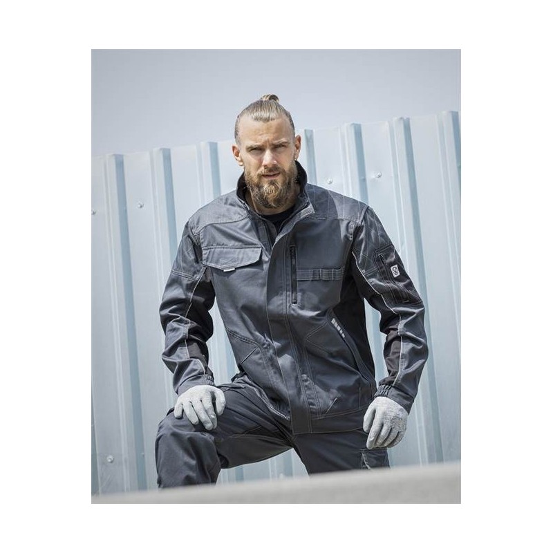 Vyriškas darbo švarkas iš VISION gaminių linijos – tai dizainerių sukurti darbo rūbai iš aukštos kokybės medžiagų. Darbinis švarkas pagamintas iš medvilnės, poliesterio ir ruožo mišinio, kuris dėl didelio atsparumo daugiausiai naudojama sunkių darbo drabužių ir uniformų gamyboje. Darbo švarkas VISION, siūlomas XXS - 7XL dydžių, puikiai tinka dėl universalaus kirpimo. Be to, prie bendro komforto prisideda ir anatomiškai suformuota paaukštinta apykaklė, reguliuojamas rankovių plotis bei užveržimas ties juosmeniu spaudėmis. Viršutinės rankovių dalies siūlės pabrėžia pečių sritį. Sustiprintos ir dygsniuotos daugiausiai dylančios vietos, apsaugo švarką nuo pažeidimų. Darbo švarko nugarinėje dalyje esanti paslėpta ventiliacija užtikrina temperatūros reguliavimą darbo krūvio metu ir sumažina nemalonų perkaitimą bei prakaitavimą. Gamindamas darbo rūbus, gamintojas neapleido svarbios darbuotojų saugos ir matomumo problemos, todėl darbo apranga siūta kontrastingu briaunu siūlu ir papildytas originaliais sidabriniais šviesą atspindinčiais raštais bei aksesuarais. Švarkas užsegamas užtrauktuku. Detalų dizainą užbaigia sportiškas liemenavimas ir daugybė funkcionalių kišenių – dvi kišenės prie krūtinės, kišenė su užtrauktuku ant kairės rankovės ir dvi apatinės kišenės su užtrauktuku. Ant darbo švarko galima atsispausdinti savo įmonės logotipą.