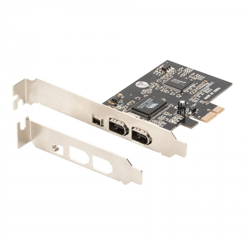 Two external 1394a and one external 1394mini port. Installs in any available PCI-Express slot with different lane width. Data transfer rate 100Mbps / 200Mbps / 400Mbps. Additional internal 1394a port + 4-pin jack for power supply