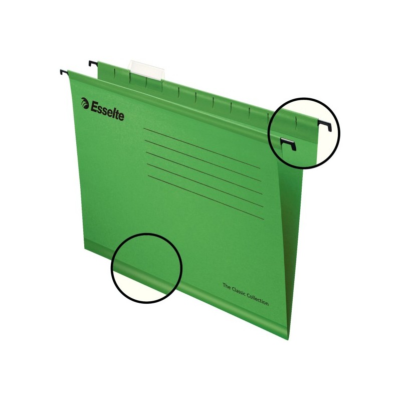 Kartotekiniai vokai ESSELTE. Skirti vertikalioms kartotekoms. Tvirto kartono dėklas su plastiku padengtais kabliukais. Sutvirtintas pagrindas storesniam dokumentų pluoštui įdėti. Ant voko gali būti tvirtinamas skaidrus užrašų laikiklis - skirtukas. Matmenys 330 x 245 mm. A4 formatas. Žalios spalvos. Pakuotėje 25 vnt, parduodamas po 1 vnt.